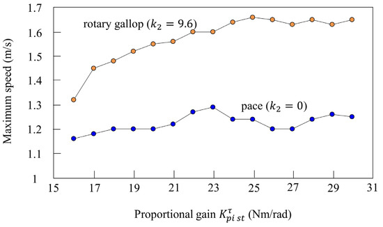 We investigated the effect of vestibular modulation ( or ) in simulation. Figure 16 shows the relationship between the proportional gain of the rotary joint and the maximum speed. First, the orange plots show the maximum speed when only was changed in various parameters that achieve locomotion at 12 s while galloping in Figure 10. Rotary gallop emerged in all cases where was between 16 and 30 Nm/rad without changing , and stable running was possible. In addition, the maximum speed increased according to the value of . The blue plots show the results of a similar simulation without vestibular modulation. In the section where Nm/rad or less, the maximum speed increased according to , but it did not increase after that. The leg swing speed increased according to the proportional gain, but it is considered that the effective propulsive force decreased because the body vibration and the leg vibration did not synchronize without vestibular modulation. Furthermore, regardless of , the maximum speed was higher with vestibular modulation than without. From these results, is robust to the proportional gain, which is one of the speed parameters, in terms of achieving gait transition.