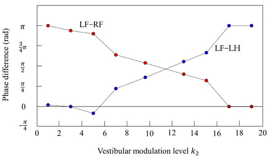 Relationship between the vestibular modulation level and phase difference. The plot shows the phase difference at each vestibular modulation level . The red plot shows the phase difference between the left foreleg and the right foreleg (LF−RF). The blue plot shows the phase difference between the left foreleg and the left hind leg (LF−LH).