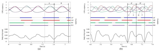 Experimental results for (a) a pace at a speed of 0.1 m/s and (b) a walk at a speed of 0.17 m/s. CPG outputs are colored as follows: LF: blue; LH: red; RF: green; and RH: purple. The footfalls are indicated by the thick line segments. The black trajectory represents the body tilt. A, A’, B, and B’ indicate periods while tilting forward. C and D indicate that the extensor neurons are activated. E and F indicate that the flexor neurons are activated.