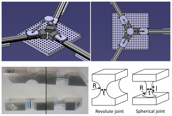 (Top) 3PRS compliant parallel manipulator developed. (Bottom) Revolute and spherical joints used.