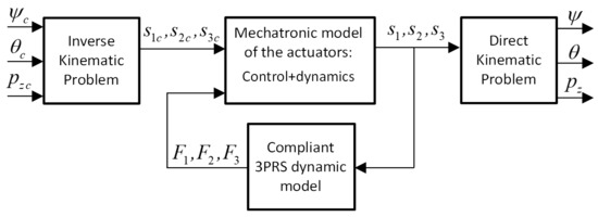 The approach followed for the mechatronic modeling is based on decoupling the 3PRS compliant mechanism from the actuators, see Figure 3, in such a way that the forces required to move the manipulator are seen as if they were a disturbance from the perspective of the actuators. In this way, it is possible to decouple the modeling of the mechanism from the modeling of the actuators, which can be more detailed with several degrees of freedom if desired.