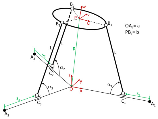 The kinematic diagram of the 3PRS manipulator is shown in Figure 5. The mobile platform has the end effector in P. Three bars CiBi of equal length L connect the base and the mobile platform by means of an actuated prismatic joint P, a revolute joint R in Ci, and a spherical joint S in Bi. The angles αi between the bars and the fixed base are 45° in the default position. The Bi points are in a circumference of radius b with center in P. The origin of the linear actuators is located in Ai over a circumference of radius a and center in O. The actuators are inside three vertical planes at 120°, and their location is defined by the joint space coordinates si.