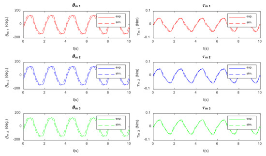 What is more, the profile of the torque signals in both figures suggest that there are nonlinearities in the system. Part of it is due to the dry friction in the actuators. However, after examining separately the manipulator and the actuators with the linear belt drives, the cause of that nonlinearity lies mainly on the linear belt drives, where the belt is not stiff enough to properly actuate the compliant 3PRS. The belt is preloaded and works under traction but, under higher forces, it is further deformed. As the length of belt under traction is not the same when the drive moves in positive and negative directions, its stiffness also changes depending on the direction of the motion. In addition, the top and bottom of the angular position in the motors are flat, which could be related to this behavior of the belt drives.