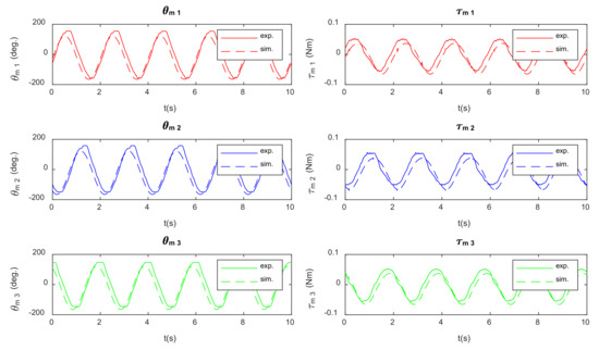 Experimental vs. simulated signals: (Left) Angular position of the motors. (Right) Motor torque.
