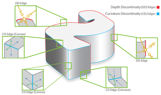 The Canny operation considers potential edges as contiguous sets of pixels with locally maximal gradient magnitudes where the associated gradients points in the direction perpendicular to the underlying edge. Thus, it locates region of significant discontinuities within the presented depth image. Though this is able to register edges bounding regions of high gradient changes, it fails to recognize CD edges within the silhouetted regions of the scene. Notwithstanding, the Canny operator is implemented according to the literature [24] to produce edges associated with the scenes’ silhouette. We classify these edges as depth discontinuity (DD) edges and store them in binary 2D array called .