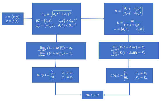A flow diagram indicating the logic operations performed on a depth map to obtain DD and CD features necessary in generating surface contours.
