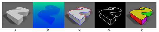 Series of steps relied upon to isolate individual surface segments. (a) Initial Scene (usually depicted by an RGB image). (b) Depth Map in accordance with . (c) Extracted DD (red) and CD (blue) features as described in section above. (d) Closed contours generated by a union operation of DD and CD maps. (e) Final segmentation process separates the surfaces with respect to their bounding contours. In this case, each contour is represented by a distinct color.