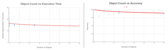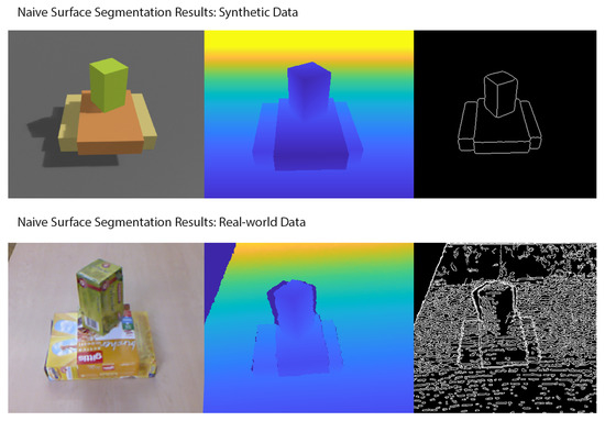 In this section, shortcomings relating to contouring quality and segmentation run-time performance are discussed. To begin, small artifacts resulting from unfiltered noise may present themselves as false-positive contours. Though many of these artifacts are a result of transient noise that may generate fleeting contours, some noise may produce artifacts that may persist across time. Smaller artifacts are trivially removed by filtering contours by size. Consequently, applying such an operation removes contours in the scene after the formation process, resulting in non-uniformly shaped contours which may not encompass the entire surface segment. While most of these persisting artifacts are small enough to be filtered by size, for still frames, larger transient artifacts may persist across frames and are, therefore, more difficult to filter by size or by transient noise. In this case, these contours routinely present themselves as subcontours dividing an actual surface segment. Likewise, false-negative contours may arise as contours may be erroneously merged during the robustification phase. More precisely, while we attempt to utilize a kernel size for the majority of our convolution and morphological operations, edges that are relatively close together may be merged due to resolution constraints and distance of the surface from the camera. While this may cause a hindrance with lower resolution cameras, the presented approach was able to decipher edges as thin as 5 mm with the camera approximately 1 m away at a resolution of . A corollary of this would be that, given a high-density depth frame, our proposed approach should be able to exceed the performance presently established in this presentation. In addition to the surface segmentation quality, Figure 12 appears to represent the non-intuitive result that run-time speed is inversely correlated with scene clutter. This discrepancy is a consequence of the contour formation and filter procedures defined in Section 4.2.2 and Section 4.2.3 where larger surface segments require greater execution time to calculate contours details such as size. This results in greater run-times for less cluttered scenes with larger objects.