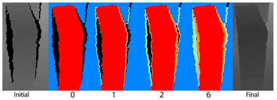 - The results of morphology band-pass filtering applied to the contour, , is obtained via image differential operations, and . The operator is:The resulting binary image removes high-frequency and low-frequency features, such as kinks and sharp corners, within the contour and presents a smooth set of lines to be used for segmenting.