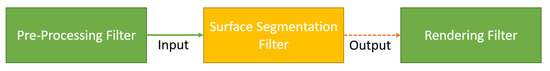 One of the main goals in designing our applications was to allow various strategies to be chained together in such a way as to allow a robot to robustly interact with its environment in real-time. To accomplish this, we rely on a pipeline architecture approach wherein each frame captured from a scene is fed into an algorithm stack and a final rendering policy is presented as an output. The internal group of perception-based algorithms used within the pipeline to accomplish such a task is commonly known as filters. To maintain real-time performance, each filter within a pipeline should accomplish its task within 30 milliseconds, and the entire pass-through time along the pipeline should also not exceed 30 milliseconds. A brief example of a simple filtering pipeline is present in Figure 7 where a pre-processing filter captures and performs filtering on an input before forwarding the resulting data to the next pipeline stage. This process continues until a final consumer stage renders the resulting data to display. For thread safety, a shared double-ended queue implemented as an underlying circular buffer is used to transfer information across pipeline stages. After completing its task, a pipeline filter waits for subsequent data to be provided by the prior filter. Each filter is allocated a set of CPU threads depending on its performance requirements. Thus, our application pipeline can capture RGB-D frames on a FIFO basis, wherein pre-processing filtering is applied as described previously in Section 3.4 before relaying these frames to the Surface Segmentation process. This process further applies a series of lower-level filtering algorithm to remove additional noise and capture object segments within the scene. Because the procedures to perform the surface segmentation algorithm are performed in series, each executable step underlying the algorithm may also be considered a self-contained node that could be assigned its pipeline stage. For instance, the DD edge procedure, and CD edge procedure may have been extracted as an entirely separate node. We decided to keep these procedures in line to maintain design cohesion. Moreover, the application architecture allows algorithms to be executed on any arbitrary device. In this case, the underlying surface-segmentation algorithms utilize the GPU to accelerate performance. Thus, these procedures were written primarily in CUDA, but GLSL or general x86 implementations may also be utilized where possible. The individual stages of our architecture are illustrated in the UML diagram of Figure 8.