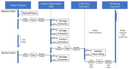 A depth frame is represented by a 2D map of discrete pixel values. In order to perform the surface segmentation operations described in Section 1 while maintaining real-time performance (30+ frames per second (FPS)), we sought to translate the presented continuous algorithm to discrete pixel-wise operations. This section covers software design details and the necessary application structures utilized to maintain real-time performance. We touch on libraries and dependencies used in constructing our application. Data structures and performance algorithms are heavily relied upon to maintain real-time performance. We begin this section by introducing the application pipeline and architecture choices used to maintain faster than real-time performance.