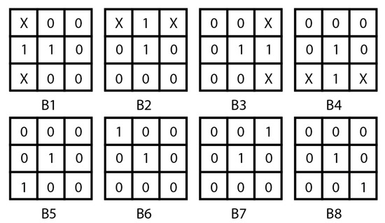 Remnants of kinks and other filtered perturbations may present themselves as short protrusions from an edge after a morphological band pass filter is applied. To remove these artifacts, we follow the pruning algorithms presented by Jang and Chin [25]. Specifically, we rely on a lookup table (LUT), to decipher the appropriate morphological operation to apply given a specific set of structuring elements B as indicated in Figure 9. Relying on these structuring elements, the pruning process essentially follows the morphological steps realized in (10) as follows: