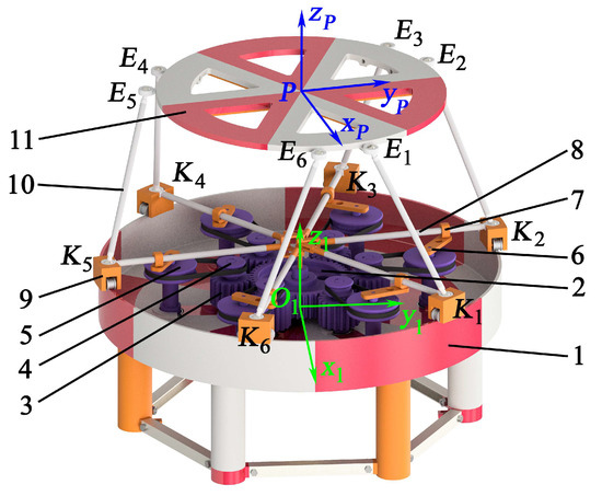Pulleys 4 and 5 connect between themselves by a belt. Rod 10 forms spherical joints on both sides with carriage 9 and platform 11. Points and with i = 1 ... 6 determine the centers of spherical joints 9–10 and 10–11. Base coordinate system attaches to circular guide 1. Local coordinate system is attached to platform 11 with point P in the center of platform 11.