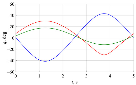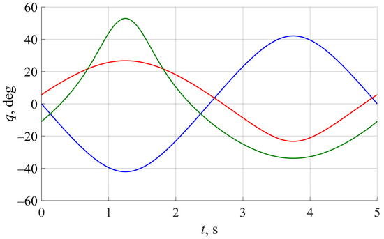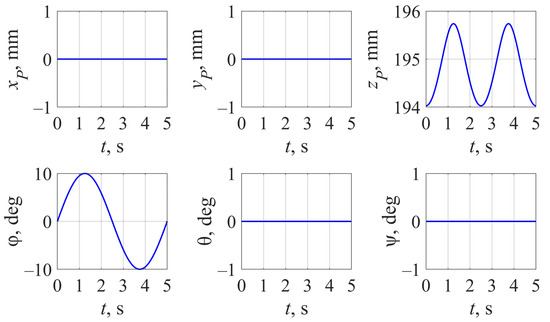 Figure 5 demonstrates the calculation results for platform trajectory X(t), where corresponds to expression (33). In this case, all six coordinates of the output link vary and have the same values at t = 0 s and t = 5 s.