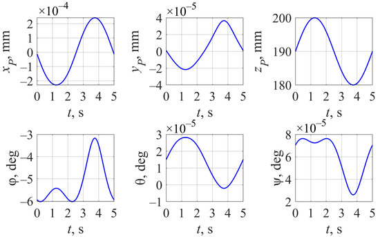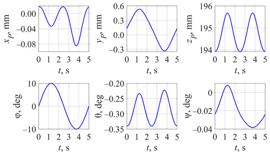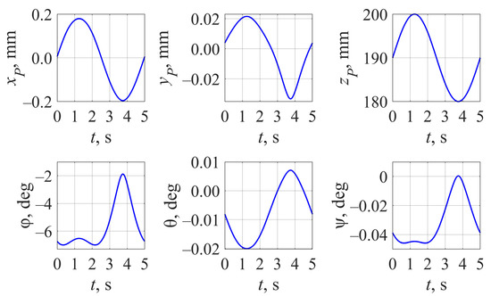 Figure 4 shows the calculation results for output link trajectory X(t), where corresponds to expression (31). It follows from Figure 4 that the changes in Cartesian coordinates and of the platform center and its orientation angles θ and ψ are negligible, and angle φ varies in a small range. The coordinates have the same values at t = 0 s and t = 5 s.