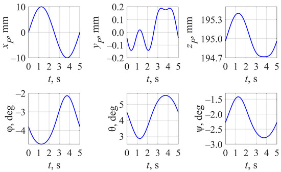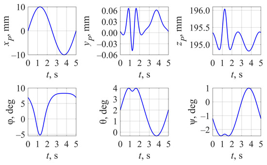 The calculation took fewer iterations than before, and the obtained results are close to (32) but differ from them and are slightly “unsymmetrical.” Figure 8 also demonstrates the resulting platform trajectory. Notice that coordinates , , θ, and ψ vary much more than earlier (Figure 4), though the output link continues to track given motion .