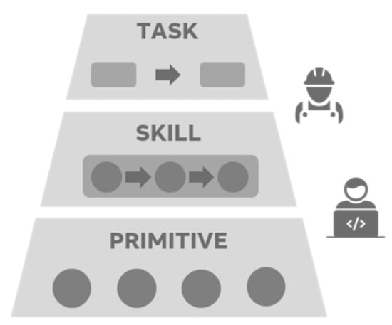 An interesting approach in the field of easy-programming research is the task-level layered framework, as described in [14]. A productive process, referred to as a task, is constituted by a sequence of standard, modular and parametric blocks named skills [15], arranged as a state machine architecture [16]. Skills may have different structures, implying a motion and a trajectory component as in [13], or have a slightly modified template as in [17,18,19,20,21]. In general, a skill is composed of a pre and post check phase, where preconditions and objectives are evaluated, and an execution phase in which elementary activities or component manipulation are performed. It must be remarked that most state-of-the-art task level programming still requires engineers or experts for creating a real industrial application, thus reducing the operative range of non-expert users. Some recent work is aimed at developing a framework that alleviates the problem of a high programming effort, e.g., exploiting the advantages of Learning by Demonstration, Learning by Programming and Learning by Interaction, combined [22].