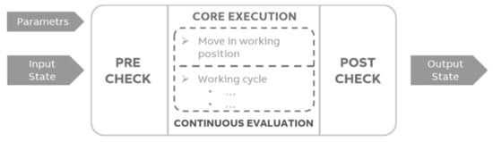 - Core Execution: the parts that effectively execute the working cycle; the Core is always preceded by an initial movement to the working position, before starting the actual operation on the workpiece. In parallel to the Execution, a Continuous evaluation of the process in the workstation is carried out, and, consequently, certain methods to handle occurring errors are implemented.