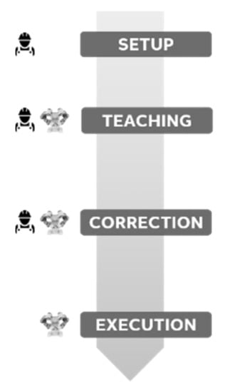 In the above-described scenario, the competencies required for creating a robotic application are split among different players. Robotics experts write the code for primitives and skill libraries, which are created after an analysis of all the involved production processes in the company, to make them as standardized as possible. The job of creating the application—generating a list of skills and thus creating a robotic metalanguage—is then assigned to the production process engineering department, who already possess the required competencies. Finally, shop floor non-expert users merely have to set input parameters for each skill during a Teaching Phase (which specifically relates each skill to the particular process), and to carry out, as a second step, a Correction phase to fix occurring errors. Non-expert users are helped in this phase by a software managing the entire teaching and correction procedure through a Graphical User Interface. These two phases will be described in detail in the following section.