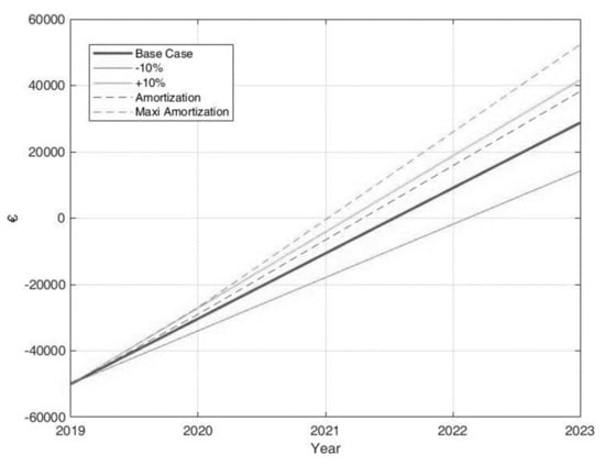 The mentioned payback scenarios are represented in Figure 5. The two additional cases reported in dashed lines make reference to a specificity of the fiscal regime that the factory department is subjected to, which further reduces the payback time of the investment.