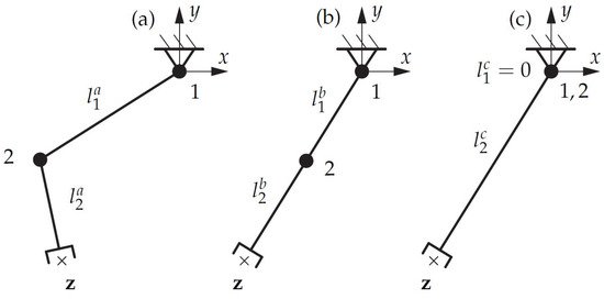 In order to minimize the DoF the distance should not be split up equally, but assigned to only one link, while the other link length will be set to zero. The corresponding joint to this link can then be removed, which means decreasing the DoF by one. This behavior can be achieved by using a pruning function (see Definition 1), specifically (4) for in (3). Running the same optimization problem again with the new objective function, the total link length is still a minimum (straight line in Euclidean space), but is now assigned to only one link. This indicates that not more than one DoF is necessary to reach the position (see Figure 2c). Thus, the corresponding joint i with can be removed and the link lengths, and the DoF is minimized.