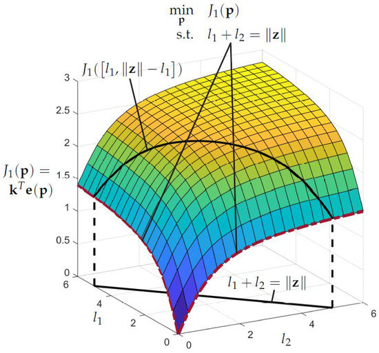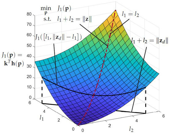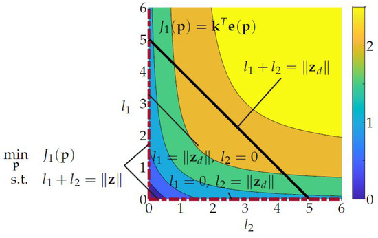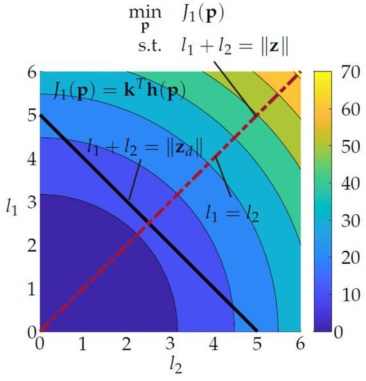 The black line in the plane represents the possible combinations of and with which the desired end-effector position can be reached, and holds. The projection of this line on the surface of leads to the curved line from which the optimal combination of and has to be chosen. The dashed red lines visualize the space of optimal combinations of and for arbitrary . Compared with Figure 3 it can now be seen that for every two solutions and with the same priority (for the special case ) exist. Both solution lie at the lower boundaries of the parameters and . This becomes even more clear when looking at the contour plot in Figure 6. The black line shows again a −45 slope, but now the contour lines are shaped in way such that the optimal solutions lie at the boundaries of . The optimal solution can be found by restricting the parameters with upper bounds in the optimization problem leading to only one solution e.g., .