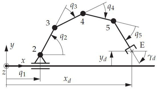 Furthermore, the length of the robotic arm has been minimized, as becomes clear when looking at the furthest point and observing that all links lie on a straight line from joint 2 to the desired end-effector position, and that this line is perpendicular to the x axis. In Figure 14 the schematic drawing of the optimal topology is shown with some joints coinciding with others and, thus, illustrating the reduction of DoF.