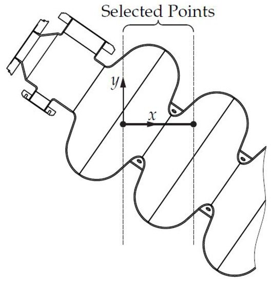 The collisions between robot and environment are calculated by discretizing the cavity surfaces and checking the minimal distances between robot links and points on the cavity surface. First, all points on the cavity surface are transformed into the body fixed coordinate frames for each robot link and then, to decrease the computation time, only points that can possibly collide and, thus, lie in the selected points area (see Figure 9) are considered. The minimal value of the projection of all possible collision points onto the y axis of the body-fixed coordinate frame is considered the minimal distance. Collisions are taken into account in the function in (12). Self collisions between robot links are not considered, since it is assumed that this is mechanically impossible, as known from Scara robots.