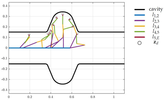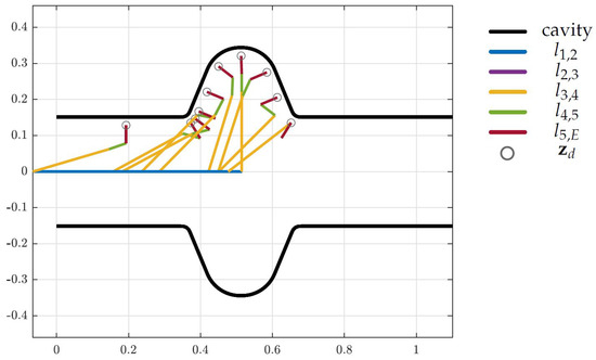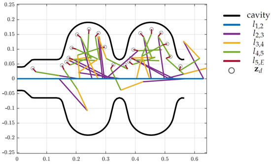 As mentioned in Section 5.1 the desired Cartesian position and orientation is of dimension three and, thus, a mechanical structure with exactly three DoF is able to reach all desired end-effector positions in an environment without obstacles or other constraints. As shown in Figure 13 the restriction caused by the LINAC cavity allows a three-DoF robotic arm to reach all positions. Thus, the optimization reduces the tentative topology by two DoF, which is visible in Figure 14, but more clear in Table 2, where the lengths set to zero correspond to the removed DoF.