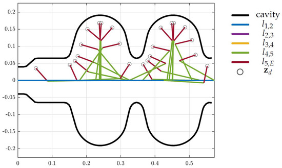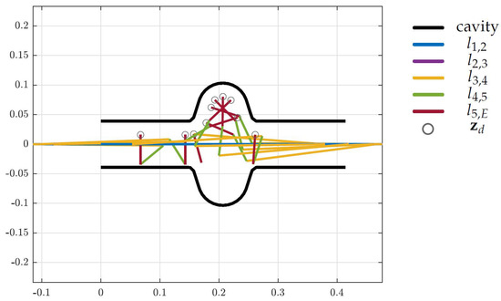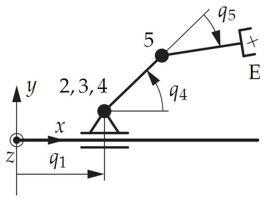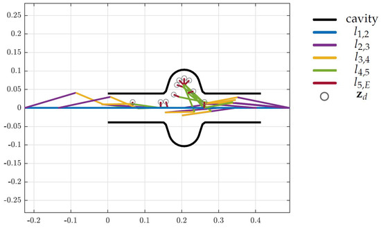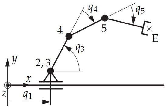 The surrogate model defining the design space has been set up with one translational and four rotational joints with parallel rotation axes, summing up to five DoF, as shown in Figure 8. Table 1 lists the initial link lengths, where describes the lengths from joint i to joint j. These lengths are evaluated by launching an optimization problem, as described in Section 5.4, that returns feasible initial states. This initial set up has been used as the starting point for the actual optimization problem in (12).