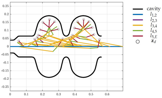The design optimization for the full system is performed by considering all three cavities as collision objects in the non-linear inequality constraints of the optimization problem. Again, the results of the optimization are shown in Figure 15, Figure 16 and Figure 17 for the LINAC, LHC and FCC respectively, where the colored lines represent the robot links, the black curves indicate the surface of the cavities and the gray circles show the desired end-effector positions. The resulting topology is shown in Figure 18 and the corresponding link lengths are listed in Table 3.