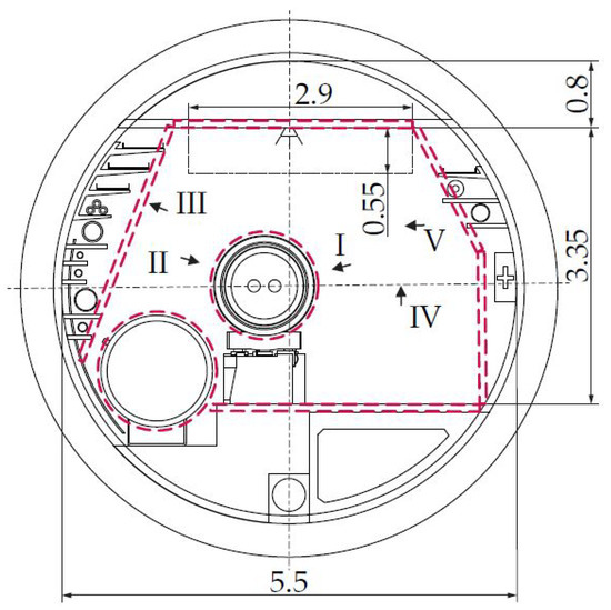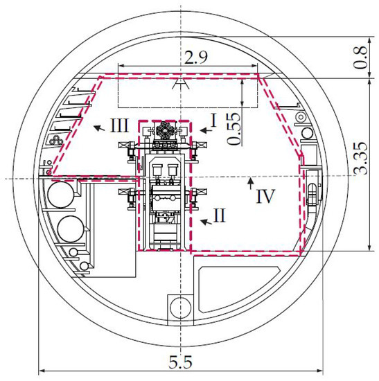 The environment of the FCC tunnel and the robot have been approximated by convex geometric primitives; here, specifically, by Matlab’s AlphaShapes [24], which can easily be passed to a function to calculate the minimal distance between two AlphaShapes. The approximation of the FCC environment with cylinders and boxes is indicated by red, dashed lines in Figure 20 and Figure 21 for the FCC-ee and FCC-hh machines, respectively. The manipulator should be able to reach all points of interest (I–V), which represents the most diverse remote maintenance tasks at the current Large Hadron Collider—LHC, see [25,26,27,28].