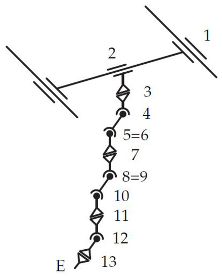 The process of defining the surrogate model, as shown in Figure 19, is described in detail in [2]. Here, it should just be mentioned that joints 1 and 2 are translational joints, 3–6 and 7–10 form two planar mechanisms in order to fold the arm. Joints 11–13 represent a robotic wrist and, thus, the solution for its position and orientation can be decoupled in point 12, which simplifies the optimization problem. The planar chains allow for minimizing the link lengths between joints with parallel axes, and, thus, possibly eliminating joints connected by links with zero length, hence, eventually reducing the DOF. The initial link lengths in Table 4 have been found by the same means as described in Section 5.4.