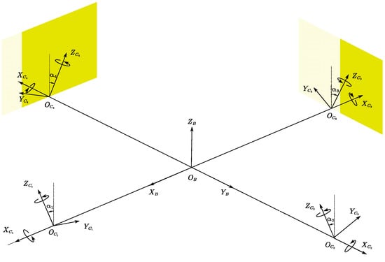 A tiltrotor is a type of modified quadrotor whose directions of thrust are able to change [,,,,,,]. Figure 1 illustrates a tiltrotor. Here, the direction of each thrust is shown in the corresponding yellow plane. For details of the kinematics, [,,,,] are recommended.