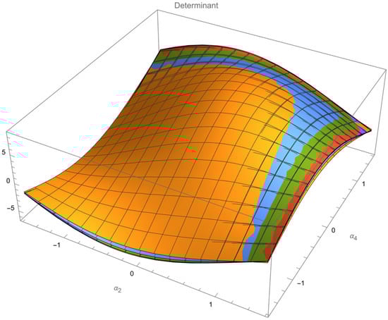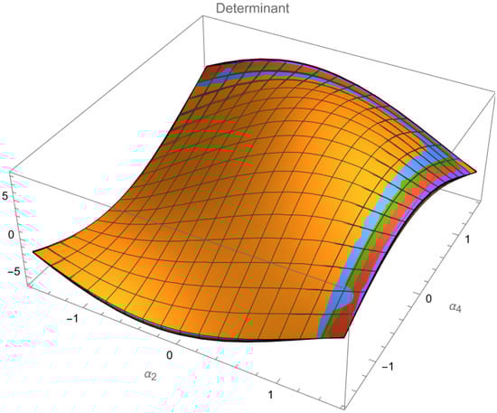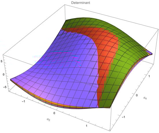 This section presents the results for some cases satisfying . Specifically, . Figure 6 plots the left side of Condition (19). The result is five surfaces about . Intercepting the surfaces in Figure 6 by the zero plane () yields Figure 7. Figure 7 plots , violating Condition (19).