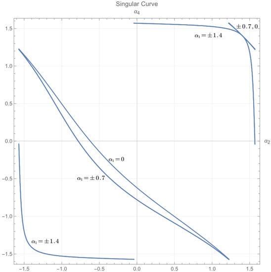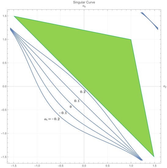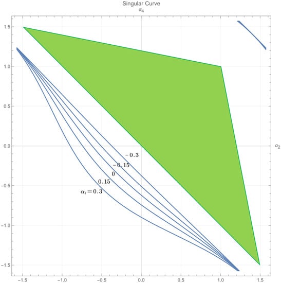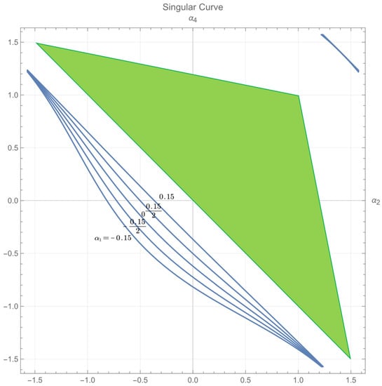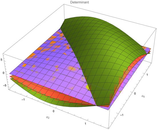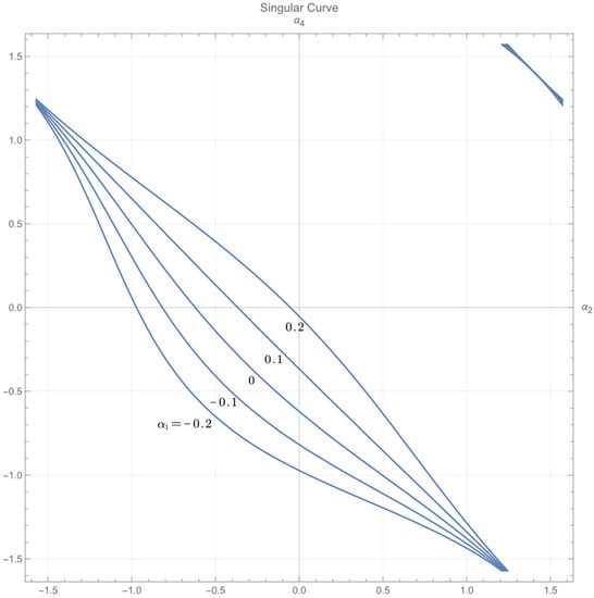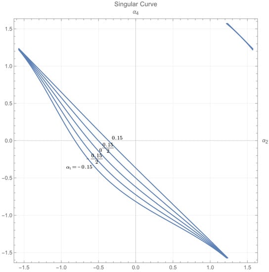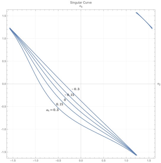 This section demonstrates the result for some cases satisfying . Specifically, . Figure 2 plots the left side of Condition (19). The result is five surfaces about . Intercepting the surfaces in Figure 2 by the zero plane () yields Figure 3. Figure 3 plots , violating Condition (19).