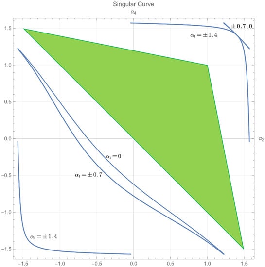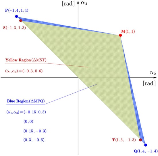It can be concluded from the green region in Figure 10, Figure 11, Figure 12 and Figure 13 that any located within or on the edge of the triangular zone defined in (22) for each case in Section 5.1 will not violate Condition (19).