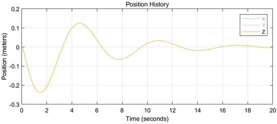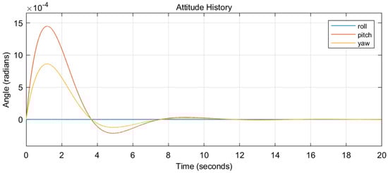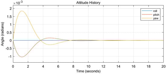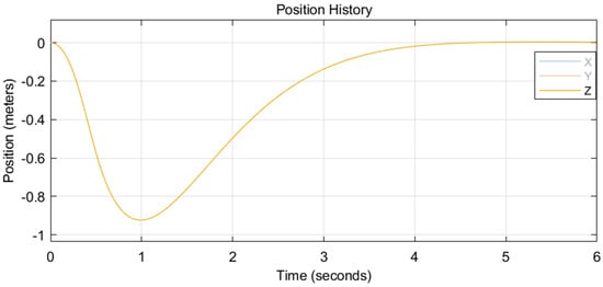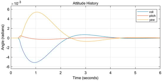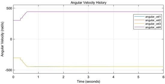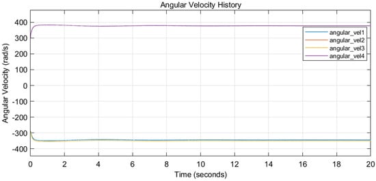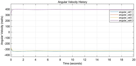 This section presents the control result for an over-actuated controller with eight control inputs, used to complete the same task with identical parameters and initial conditions. The attitude history, the altitude history, the angular velocities history of the propellers, and the tilting angles history are plotted in Figure 24, Figure 25, Figure 26 and Figure 27, respectively.