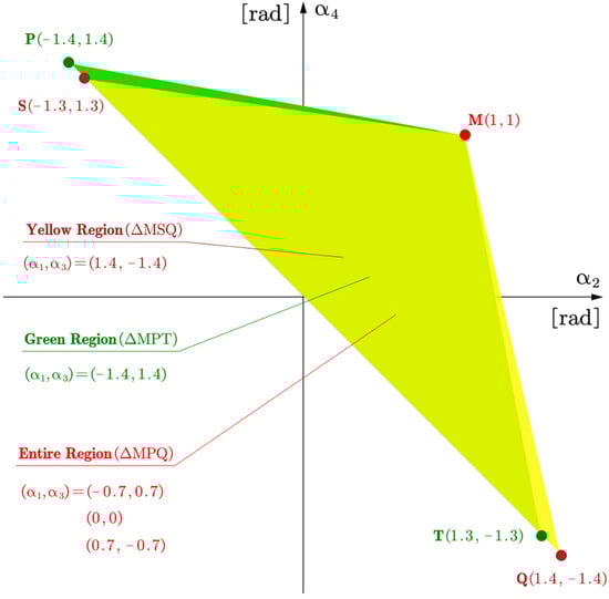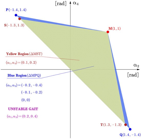 Admissible when . M represents the gaits satisfying . P, S, T, Q represents the gaits satisfying , , respectively.