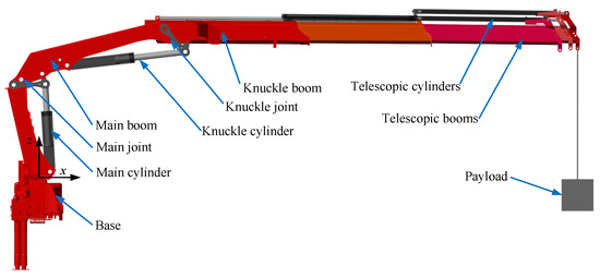 Crane geometry showing joint angles, lifting radius R, telescopic length , and crane tip position.
