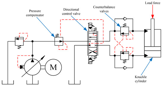 In this paper, a HMF 2020K4 loader crane made by HMF Group A/S (Højbjerg, Denmark) is used as a basis for simulations and experiments; see Figure 1. The crane has three degrees of freedom of interest: the rotation of the main boom, the rotation of the knuckle boom and the extension of the telescopic booms. They are controlled by means of the main cylinder, the knuckle cylinder and, working as a single sequential cylinder, the telescopic cylinders. Each cylinder is driven by a pressure-compensated directional control valve, which ensures load-independent flow control. Counterbalance valves are used for load holding, assisting in load lowering, and protection against pressure surges. An illustration of the hydraulic system for the knuckle cylinder is shown in Figure 2.