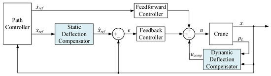 The novel approach is shown in Figure 3. The crane is running path control in the actuator space with position feedback and velocity feedforward developed in [22]. The control strategy for the deflection compensation is split into static compensation and dynamic compensation. The static deflection compensator uses feedforward and adjusts the position reference based on an estimated deflection for a given actuator position. The dynamic deflection compensator uses feedback of the load pressure to measure and suppress the oscillations of the crane.