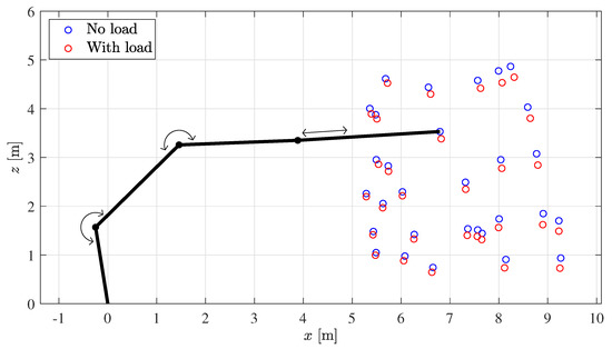 Multiple measurements are conducted with different cylinder positions. The resulting crane tip position in the -plane with and without load is shown in Figure 5, with the black lines illustrating the crane position for one of the samples. Deflection is calculated as the difference between the load and no-load tip position.