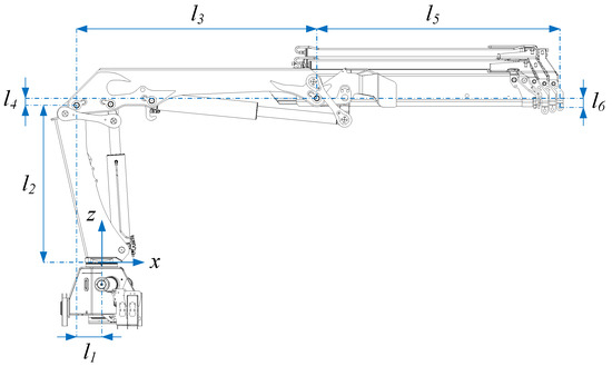 Forward kinematics are used to go from joint space to Cartesian space. The forward kinematics are calculated based on Denavit–Hartenberg parameters. Figure 6 shows the joint angles, telescopic length, lifting radius, and tip position. Figure 7 shows the geometry which is used with the Denavit–Hartenberg parameters, where both booms are horizontal. The dimensions between consecutive joints are shown in Table 1. The Denavit–Hartenberg parameters are shown in Table 2, where and are rotational and translational matrices, respectively. The angles and denote the rotation about the main joint and knuckle joint, respectively. The forward kinematics are similar to what was developed earlier in [23], with the addition of the telescopic actuator length used in this paper.