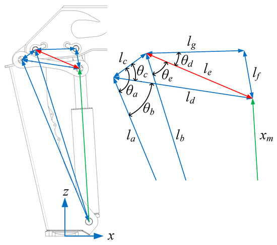 Actuator kinematics are used to go from actuator space to joint space. They were developed earlier in [23]. An illustration of the main joint linkage is shown in Figure 8. The associated lengths are given in Table 3.