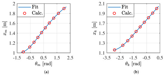 While the mapping given in Equation (28) describes the actuator kinematics for the main cylinder, the inverse kinematics is the mapping . Iteratively calculating and plotting and then switching the axis gives a solution on which the curve is fitted. The coefficients for the main cylinder and knuckle cylinder are given in Table 4, and plots of the curve fits are shown in Figure 9, showing that the curve fit yields a close match to the numerical inverse.