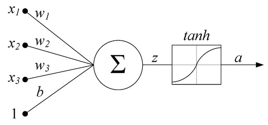 Forward propagation for the hidden layer and output layer using tanh as the activation function is shown in Equations (35)–(38).