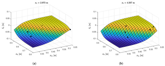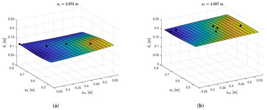 The measured deflection from the laboratory is used to train the network. The network is trained using and and converged after iterations. Surface plots of the estimated deflection for some cylinder lengths are shown in Figure 12 and Figure 13. It can be seen that the telescope length does not significantly impact the deflection in x-direction, but it has a major contribution to the deflection in the z-direction.