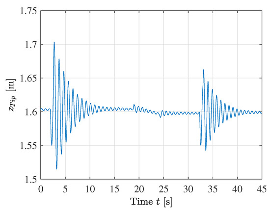 In the laboratory, the oscillations of the crane tip are measured using the Leica Absolute Tracker AT960. The hanging load is rapidly lifted for a short distance to induce oscillations in the crane, similar to an impulse response. Figure 15 shows the crane tip z-position in the laboratory with two load impulses for m at s and m at s.