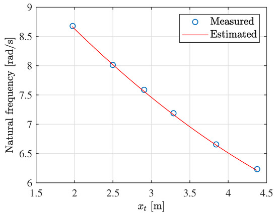 The natural frequency is extracted from the time series data, and by taking multiple measurements with varying telescopic lengths, the natural frequency of the crane tip is estimated using curve fitting. The measured and estimated crane tip natural frequency is shown in Figure 16. The formula for the estimate is given as